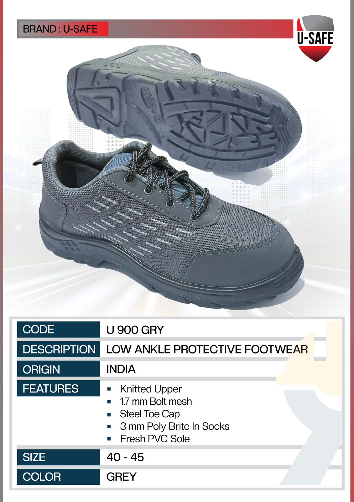 The U-SAFE U 900 BLK is an industrial safety shoe designed for workplace protection. Manufactured in India, it features a lightweight, breathable construction suitable for long working hours in construction or industrial environments.