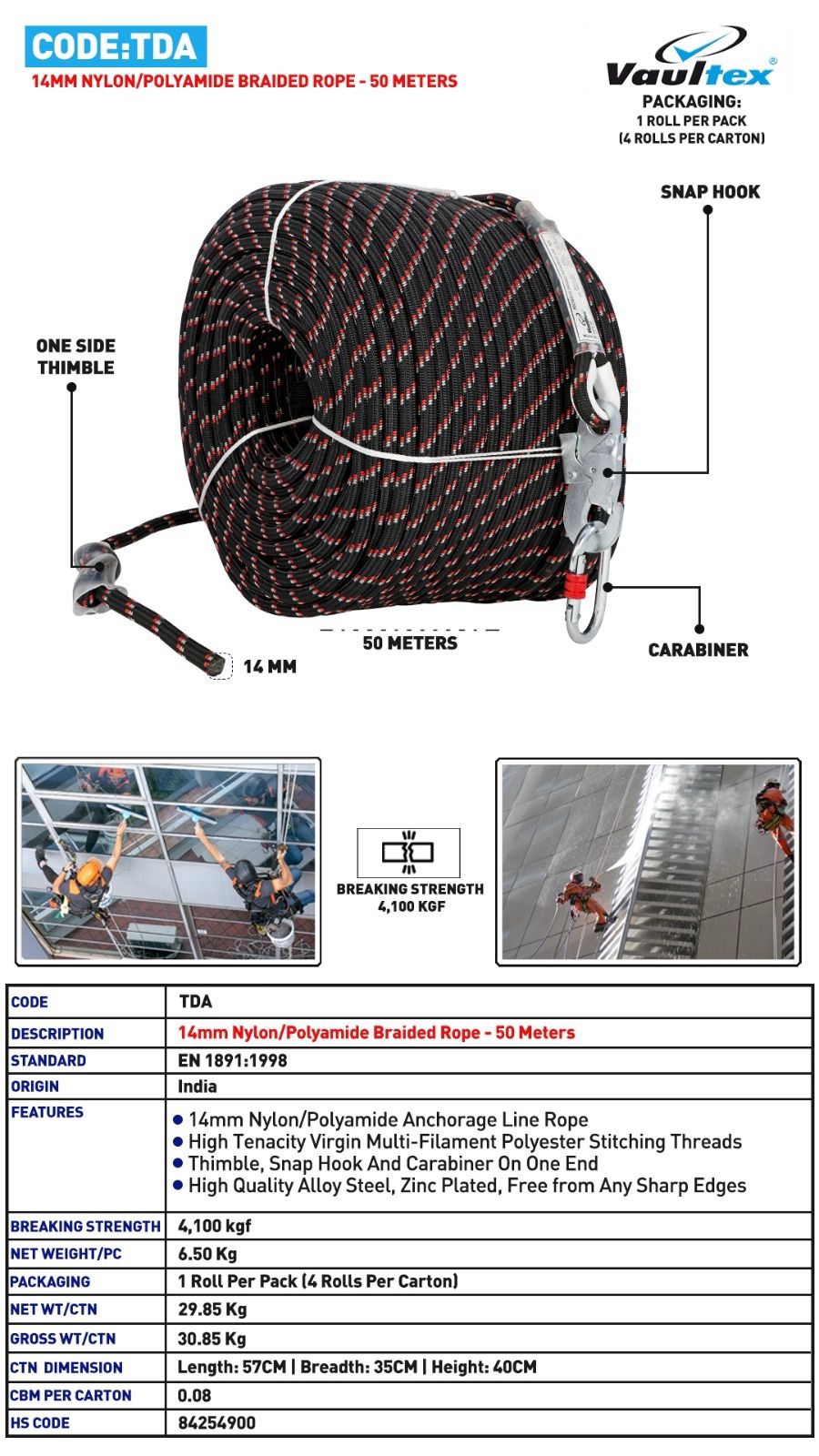 This Vaultex CODE: AHO product is a 10.5 mm nylon/polyamide braided anchorage line rope, manufactured in India and designed for use in fall arrest and vertical safety applications.