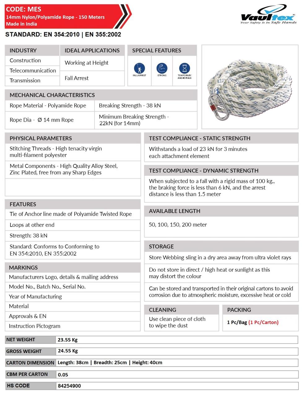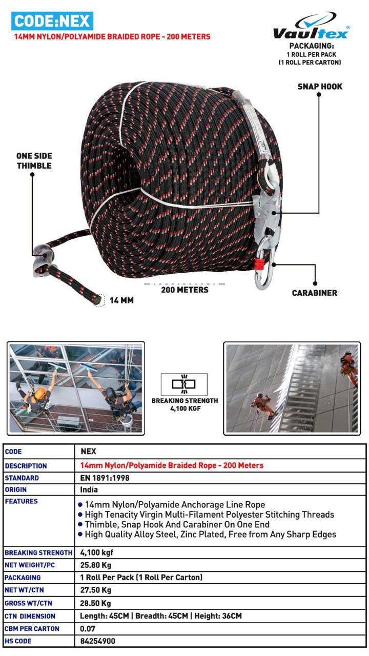 This product is a Vaultex 14mm Nylon/Polyamide Rope designed for fall arrest and temporary anchorage applications.