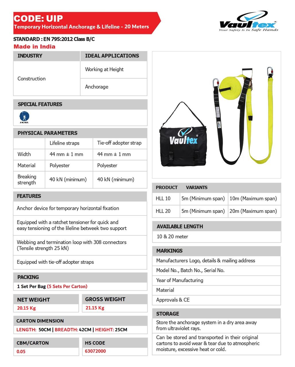 This product is a Vaultex 14mm Nylon/Polyamide Rope used as an anchorage line for fall arrest and working-at-height applications. It is certified to European safety standards EN 354:2010 and EN 355:2002.